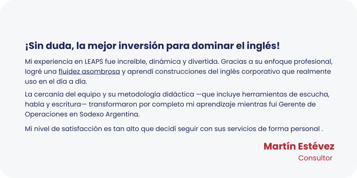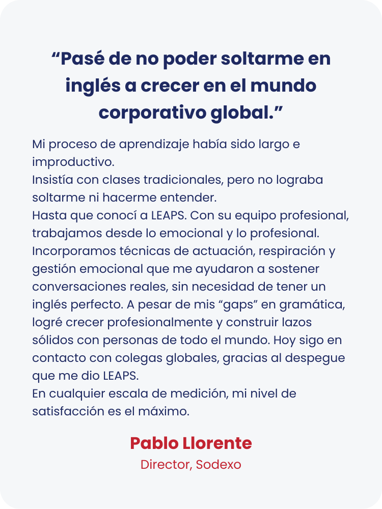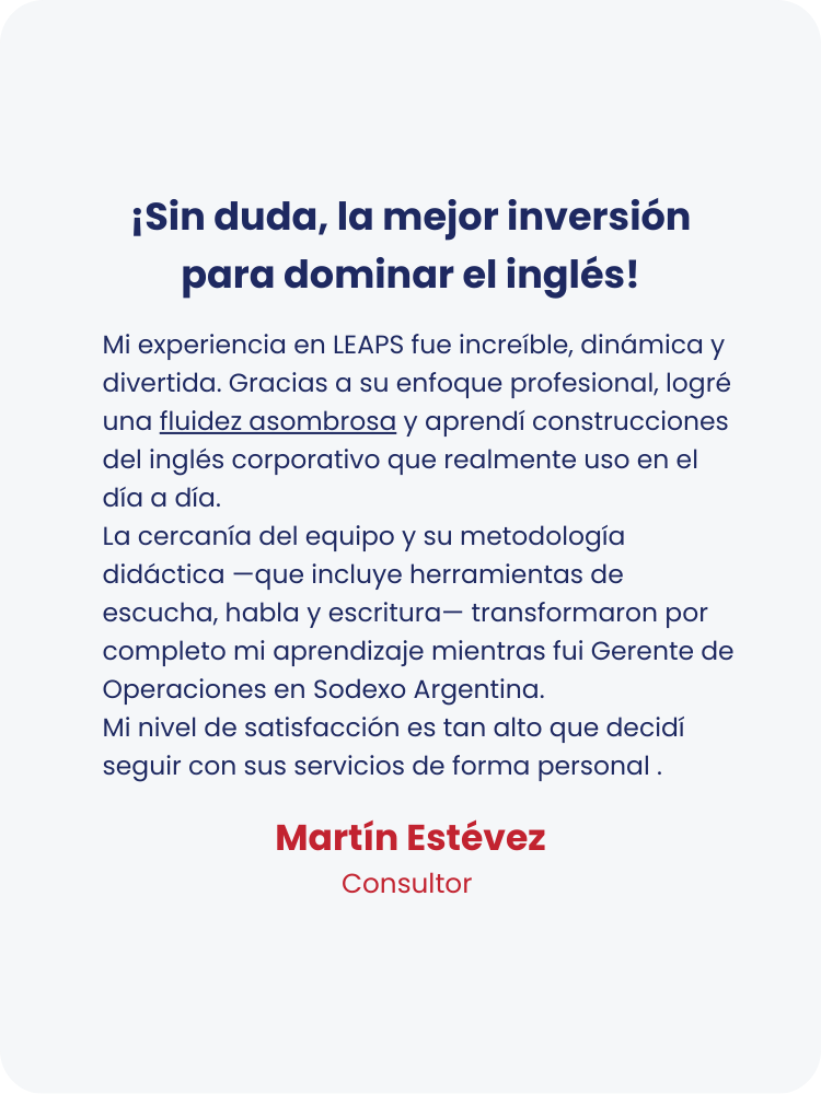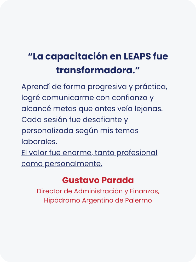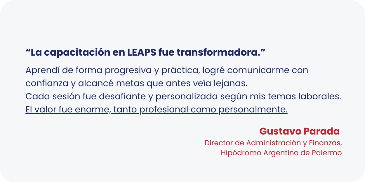 Después de LEAPS Gym, no volvés al punto de partida. Lo que entrenaste no se pierde: se transforma en herramientas que podés usar todos los días en tu trabajo. Escuchar activamente, ajustar tu mensaje con claridad, responder en tiempo real sin traductor mental. Ahora tenés recursos internos que podés activar cuando los necesitás. El entrenamiento termina, pero tu autonomía empieza.